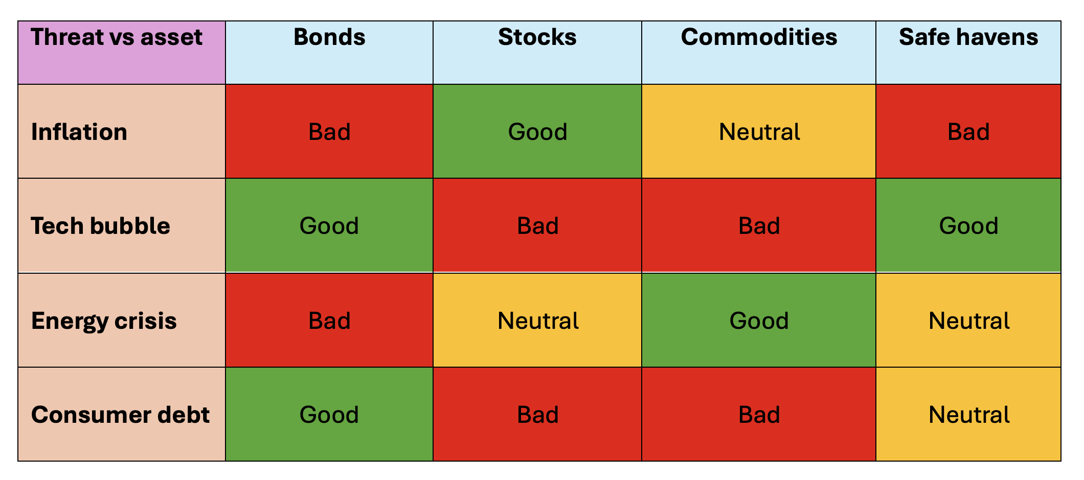 This table is an example of how different asset classes might react to each of these four competing threats.